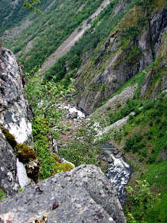 Our destination was Gudvangen, from where we drove up to the historic hotel, Stalheim. The road itself is an experience with hairpin bends to test the driver and several spectacular waterfalls. Our rooms overlook the terrace with views right down the Naeroy valley, which is alternately filled with mist and cloud, then clear enough to see the winding road down the valley following the river.